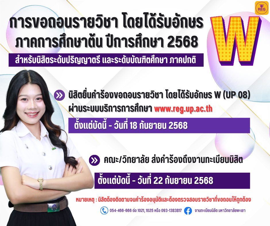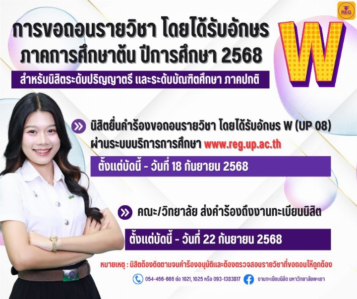 👩🏫วันสุดท้ายคณะส่งคำร้องขอถอนรายวิชาโดยได้รับอักษร W ถึง(UP 08) งานทะเบียนนิสิต วันที่ 22กันยายน 2568