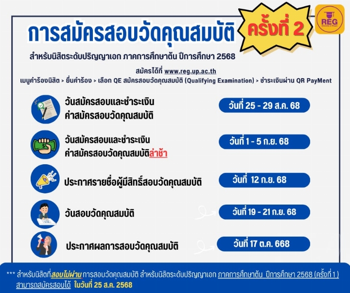 📌สมัครได้ที่ www.reg.up.ac.th เมนูคำร้องนิสิต > ยื่นคำร้อง > เลือก QE สมัครสอบวัดคุณสมบัติ (Qualifying Examination) > ชำระเงินตามใบเปย์อิน