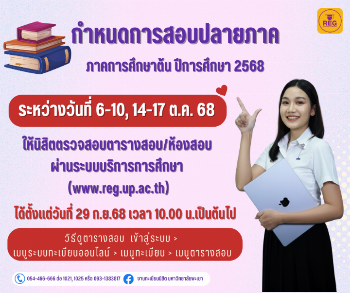 นิสิตสามารถตรวจสอบรายวิชาที่เปิดสอน ภาคการศึกษาปลาย ปีการศึกษา 2568 ได้ตั้งแต่วันที่ 20 ต.ค. 68